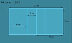 Le dimensioni del campo sono 18m x 9m, ed è diviso in due quadrati (9x9) dalla linea centrale, preferibilmente circondato da una zona libera larga almeno 3 metri